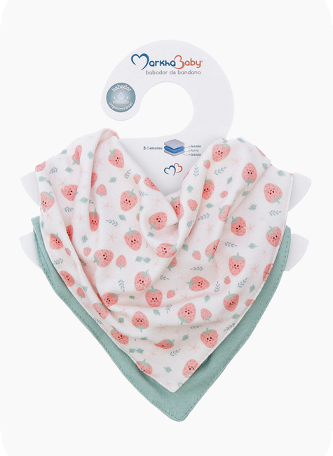 O Kit Bandana 2 Peças Markha Baby é perfeito para manter o bebê sequinho, confortável e estiloso em qualquer momento do dia. Produzidas em suedine penteado 100% algodão, as bandanas possuem 3 camadas, incluindo uma camada impermeável que impede que babinhas e saliva passem para a roupa.