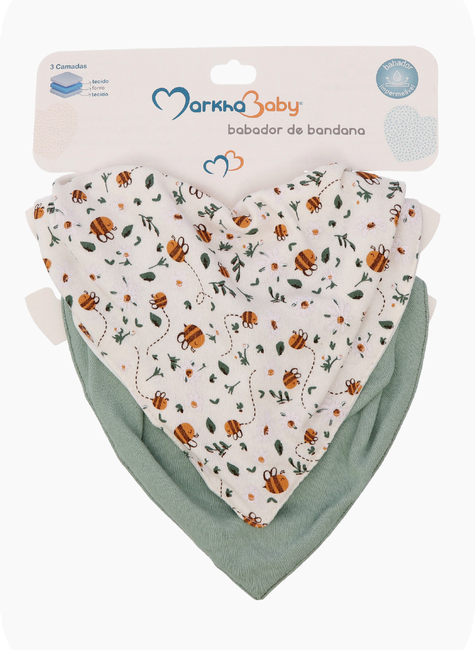 O Kit Bandana 2 Peças Markha Baby é perfeito para manter o bebê sequinho, confortável e estiloso em qualquer momento do dia. Produzidas em suedine penteado 100% algodão, as bandanas possuem 3 camadas, incluindo uma camada impermeável que impede que babinhas e saliva passem para a roupa.