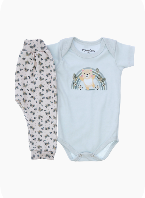 O body possui gola transpassada (envelope), facilitando a troca sem desconfortos, além de etiqueta confort, que não irrita a pele. O mijão modelo saruel garante liberdade de movimento, vestindo suavemente sem apertar a barriga.