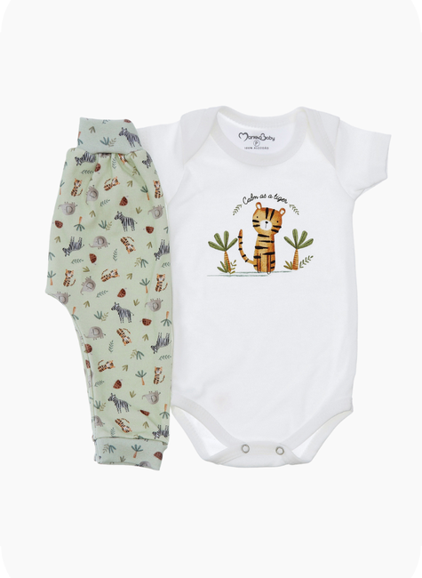 O body possui gola transpassada (envelope), facilitando a troca sem desconfortos, além de etiqueta confort, que não irrita a pele. O mijão modelo saruel garante liberdade de movimento, vestindo suavemente sem apertar a barriga.